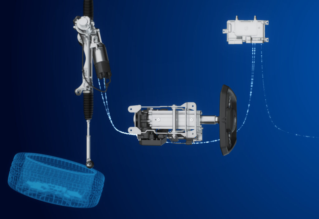 Steer-by-wire sistemi, geleneksel sistemlerin aksine, direksiyon simidi ile direksiyon dişlisi arasındaki mekanik bağlantıyı ortadan kaldırıyor. Direksiyon gücü, tekerlekler arasına yerleştirilmiş bir mekatronik aktüatör tarafından üretiliyor. Sürücünün yönlendirme komutları, yüksek dönüş açısı algılama hassasiyetine sahip bir aktüatör tarafından işleniyor.